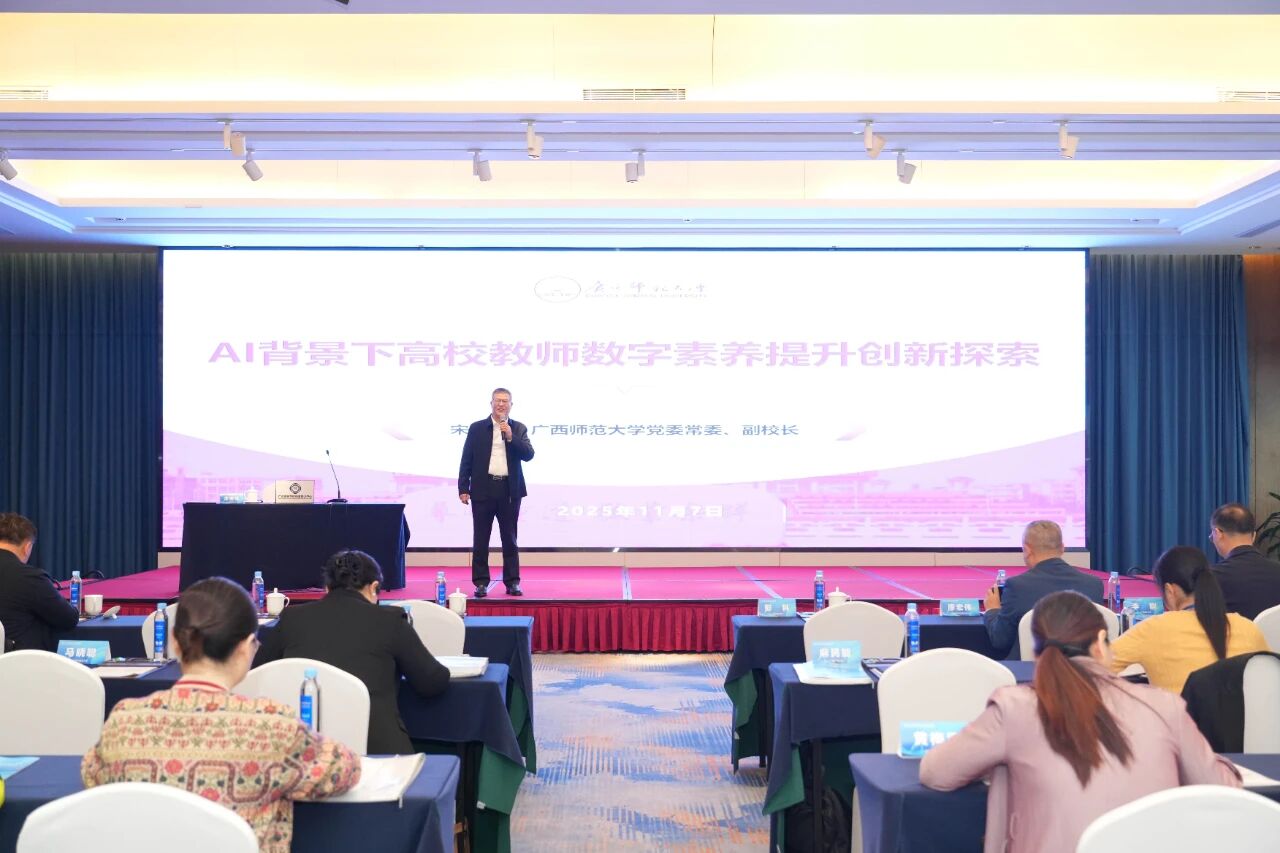主旨报告中,广西师范大学宋树祥副校长以《AI 背景下高校教师数字素养提升创新探索》为题作报告,强调 AI 浪潮中高校教师需提升数据分析与应用能力,借 AI 工具把握学生学习动态、调整教学策略。他分享了学校在课程创新、技术自研及东盟教育辐射的实践成果,为高校教师数字素养提升与教育生态重构提供系统性解决方案。