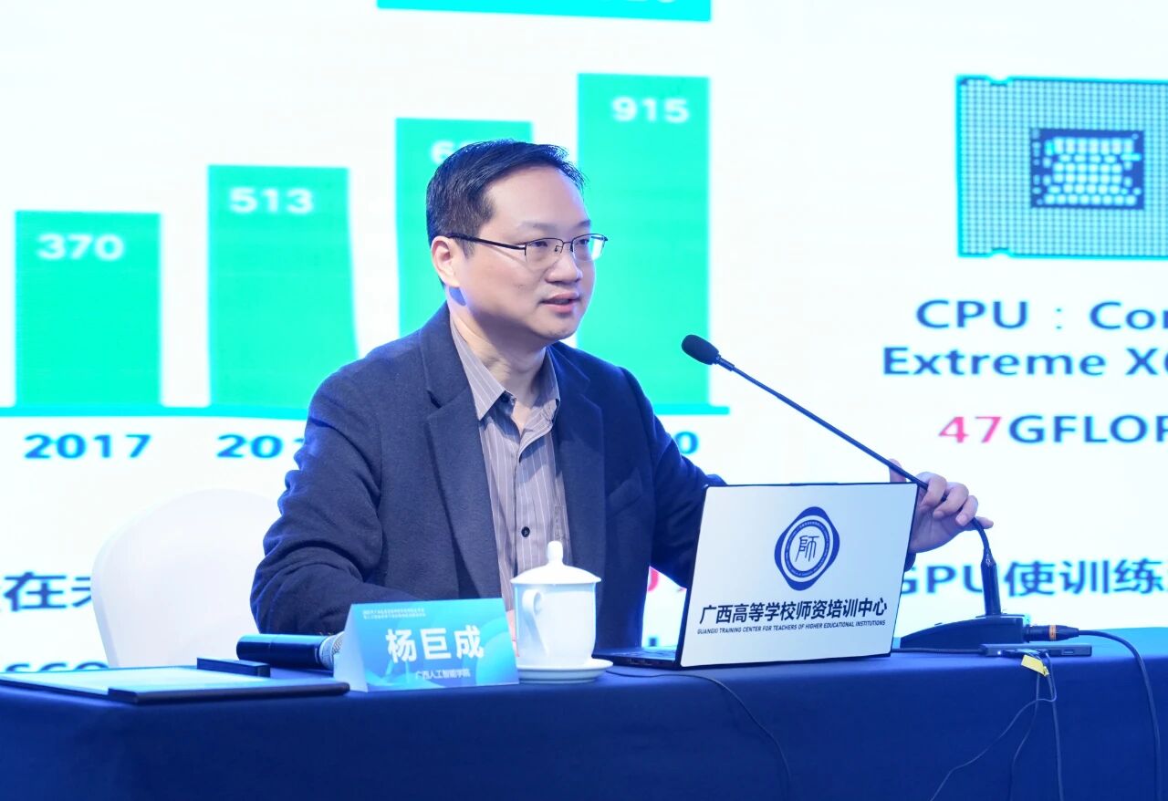 广西人工智能学院院长杨巨成教授以《人工智能前沿技术与人工智能赋能教育》为题,阐述人工智能发展历程与国家战略重要性,详解其赋能教育的优势、机遇及智能辅导等典型案例,展望教师智能素养提升等未来趋势,并简要介绍了学院的战略定位、组建方式、运行架构及师资力量。