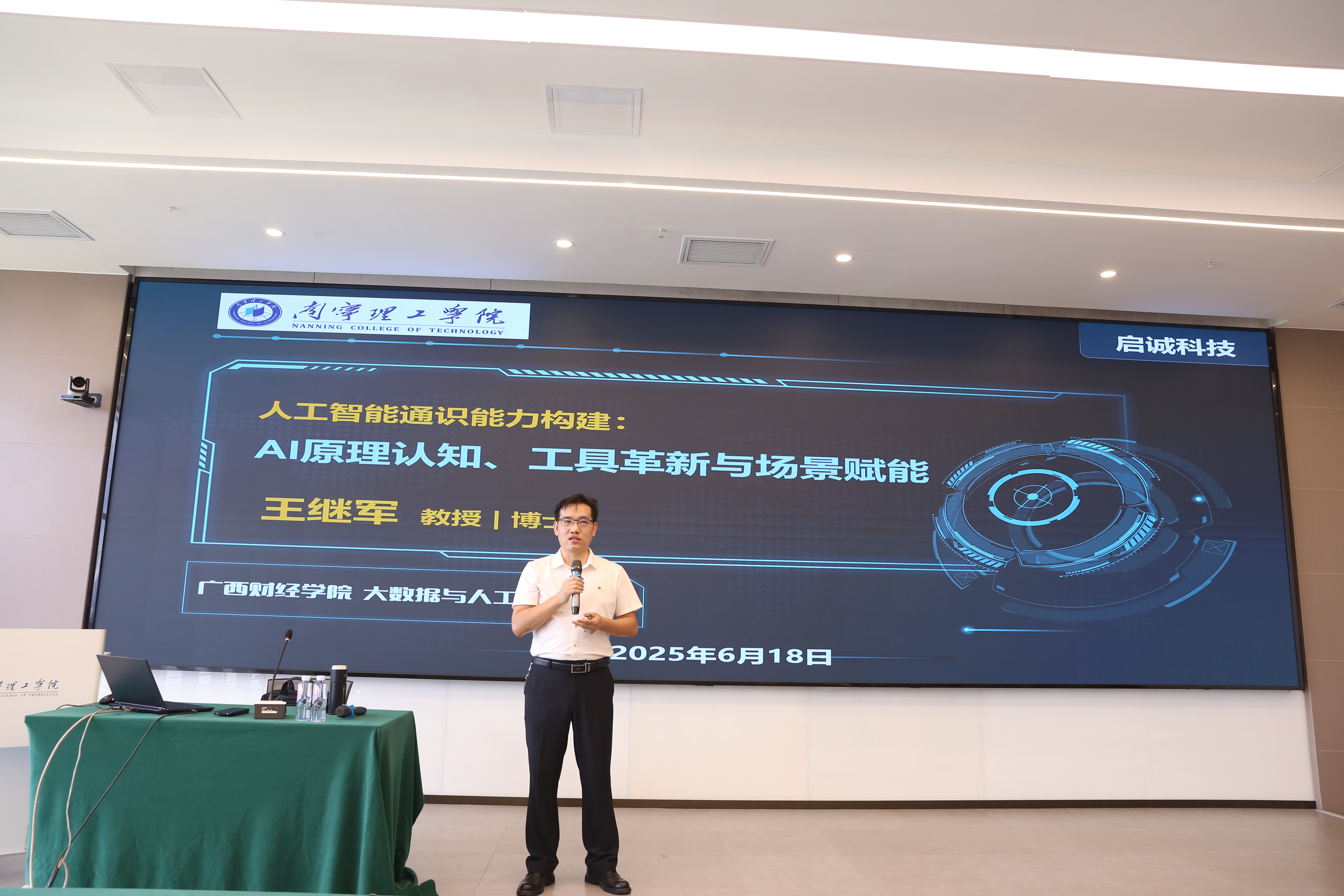 在数字化浪潮席卷全球的今天,人工智能已成为推动教育变革的核心引擎。为助力我校教师把握技术前沿、构建AI通识能力,学校特邀广西财经学院大数据与人工智能学院教授王继军老师为大家做人工智能通识能力构建:AI原理认知、工具革新与场景赋能专题讲座。